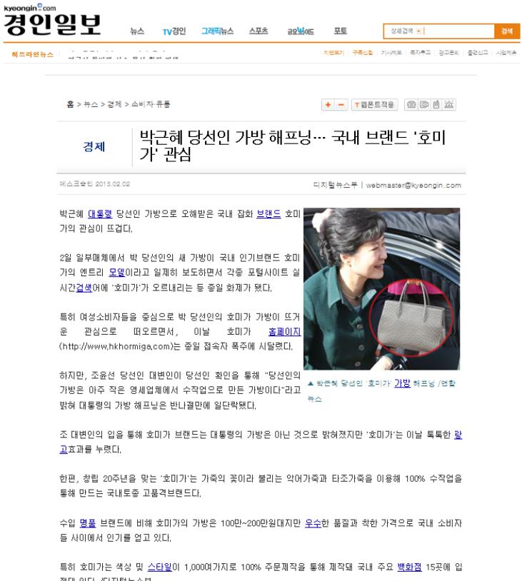 [경인일보]박근혜 당선인 가방 해프닝....국내 브랜드 "호미가" 관심
