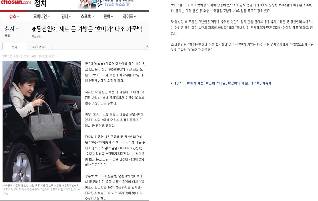 [조선일보]朴당선인이 새로 든 가방은 "호미가" 타조 가죽백 [이 게시물은 호미가님에 의해 2013-06-26 19:08:17 보도자료에서 복사 됨]