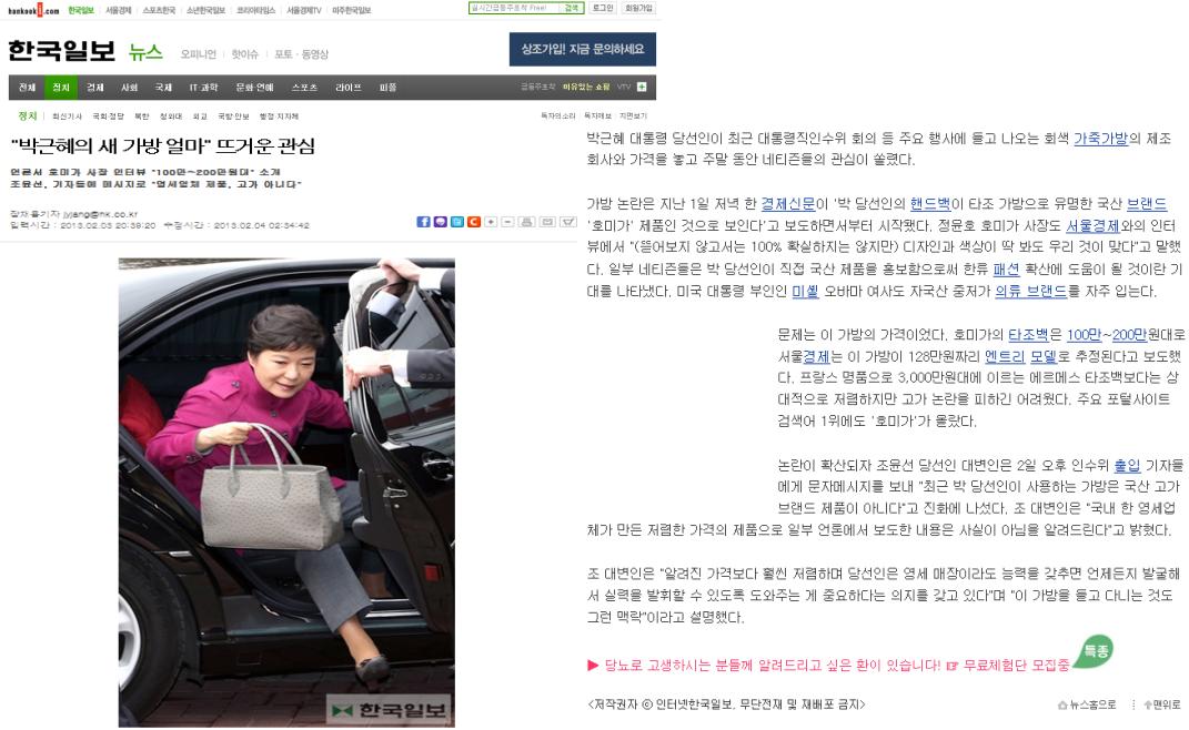 [한국일보]"박근혜의 새 가방 얼마" 뜨거운관심