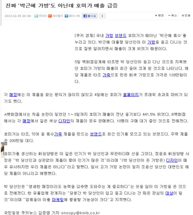 [쿠키경제]진짜 '박근혜 가방'도 아닌데 호미가 매출 급증 [이 게시물은 호미가님에 의해 2015-06-26 17:33:59 보도자료에서 복사 됨]